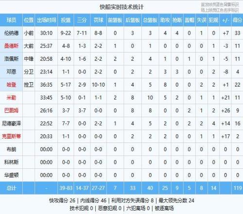 快船:倫納德33分3板4助4斷、哈登22分5板8助、尼德豪澤16分5板2助2帽、米勒11分10板5助2斷、洛佩斯11分4板1助、桑德斯11分1板、巴圖姆9分8板2帽