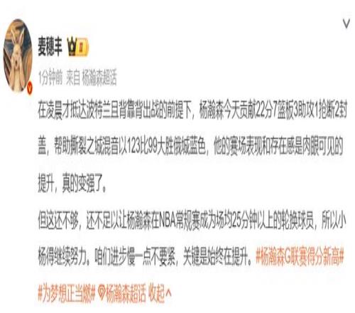 麥穗豐:楊瀚森22+7+3+1斷2帽,他的賽場表現(xiàn)與存在感肉眼可見的提升,真的變強(qiáng)了。但這還不足以讓他成為NBA常規(guī)賽場均25分鐘以上的輪換,小楊還需繼續(xù)努力。