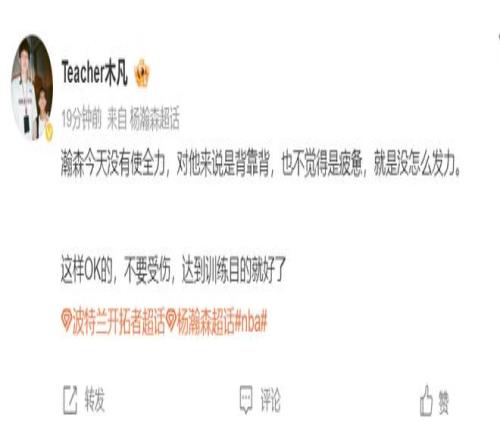 木凡:這場比賽感覺楊瀚森沒有發(fā)全力,對于他來說是背靠背也不是覺得疲累就是覺得沒怎么發(fā)力,不要受傷,達(dá)到訓(xùn)練目的就可以。