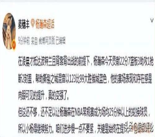 但這還不夠,還不足以讓楊瀚森在NBA常規(guī)賽成為場均25分鐘以上的輪換球員,所以小楊得繼續(xù)努力。咱們進步慢一點不要緊,關鍵是始終在提升。