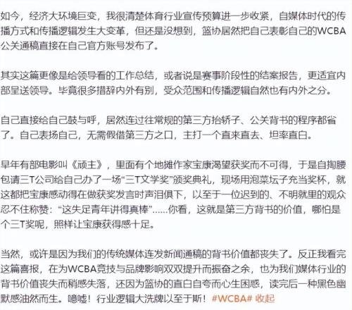 知名籃球媒體人付政浩表示:“這種明顯帶有自夸性質(zhì)的公關(guān)稿件不應(yīng)是由第三方來發(fā)布才更有背書效果和公信力嗎?現(xiàn)在都習慣直接‘王婆賣瓜自賣自夸’嗎?”