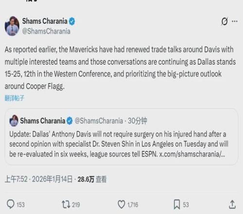 在今天早些時候,小牛方面收到壞消息,NBA知名記者Shams透露,濃眉很可能(is likely to)需要接受左手韌帶修復(fù)手術(shù)。