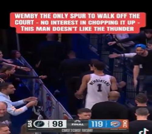 賽后,美媒曬出了雙方球員的狀態(tài)。馬刺隊當家球星文班亞馬第一時間離開了球場,他也成為了唯一一名提前離場的馬刺球員,其余的馬刺球員仍留在場上與雷霆球員擁抱握手致意。