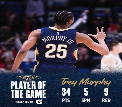 這場比賽,鵜鶘球星特雷墨菲三世打出了相當不錯的個人表現(xiàn):全場出戰(zhàn)38分鐘,投籃22中12,三分13中5,罰球7中5,拿下34分9籃板5助攻2蓋帽1搶斷,且沒有出現(xiàn)1次失誤。