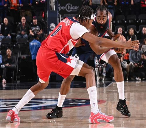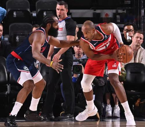 第三節(jié)奇才在喬治、巴格利、米德爾頓三人的帶領下打出一波34-17的攻防浪潮直接縮小到2分,期間哈登、小卡兩位超巨是頻頻打鐵。三節(jié)打完哈登17中5+三分9中2拿到20分7助攻5籃板,小卡三節(jié)打完13中5+三分7中3拿到19分2籃板3助攻,這兩位超巨的效率值都非常低,奇才也是趁機瘋狂追分。