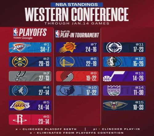 北京時(shí)間1月15日,NBA常規(guī)賽,獨(dú)行俠主場(chǎng)109-118不敵掘金。此役過(guò)后,掘金28勝13負(fù)升至西部第二,把馬刺擠到西部第三。約基奇本賽季缺席9場(chǎng),掘金取得6勝3負(fù)。獨(dú)行俠15勝26負(fù)西部第12,領(lǐng)先第13爵士只有0.5個(gè)勝場(chǎng)。