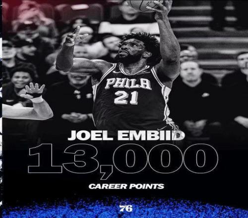 恩比德達成生涯常規(guī)賽13000分里程碑,他成為76人隊史以76人球員身份第7位達成該成就的球員。