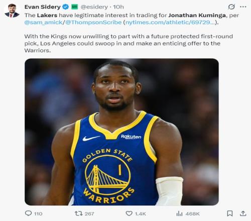 NBA記者埃文-斯迪瑞透露一個(gè)對(duì)湖人有利的消息,因?yàn)閲?guó)王連一個(gè)受保護(hù)的首輪簽都不肯給勇士所以國(guó)王、勇士的談判也陷入僵局,而且勇士不愿意接手蒙克的合同。