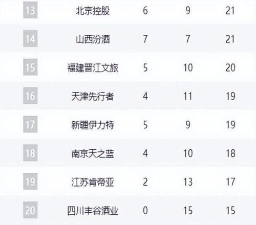 福建隊、天津隊、新疆隊、同曦隊分列第十五至第十八位。江蘇隊憑借擊敗北控的勝利,戰(zhàn)績提升至2勝13負,終結(jié)連敗,排名升至第十九。四川隊15連敗墊底,賽季前景黯淡。