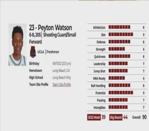 2022年6月9日美國NBA draft網(wǎng)站更新了沃特森的最后一份選秀報告,綜合評分90分,在Strength強(qiáng)壯度和NBA Ready準(zhǔn)備方面評分很低,預(yù)計選秀順位次輪39-44順位,實(shí)際選秀順位首輪第30順位,選秀模板阿里扎/厄爾-克拉克.