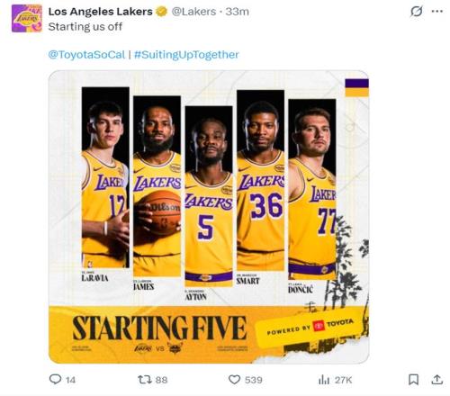 湖人:東契奇、斯瑪特、拉拉維亞、詹姆斯、艾頓;