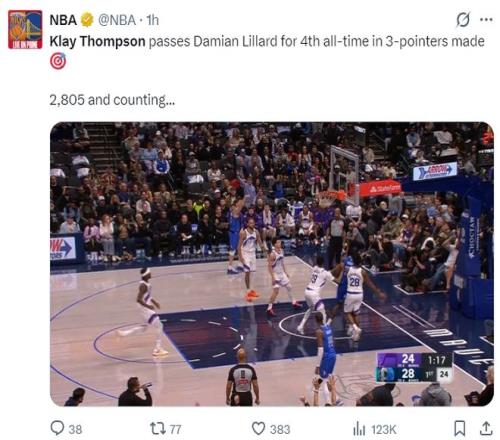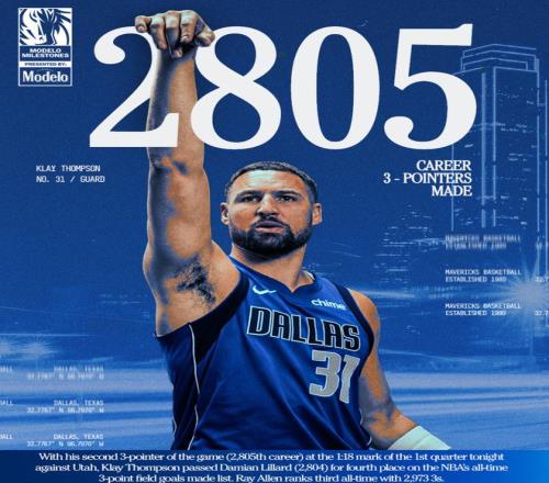 北京時(shí)間1月16日,獨(dú)行俠替補(bǔ)克萊-湯普森完成了職業(yè)生涯2805+三分超越達(dá)米安-利拉德升至歷史第四位,在他身前只剩下庫里、哈登、雷阿倫,而且這場比賽獨(dú)行俠144-123狂勝爵士,克萊的里程碑之夜非常耀眼。