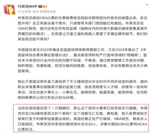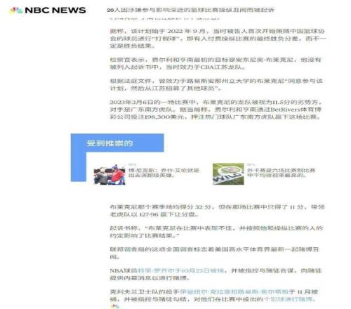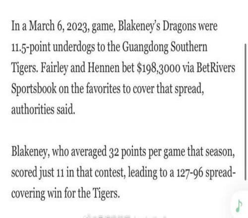 此次事件是美國(guó)媒體報(bào)道,美國(guó)這兩年真刀真槍抓了不少賭球團(tuán)伙并及時(shí)對(duì)外同步信息,此次抓到布萊克尼團(tuán)隊(duì)屬于順帶披露,還不是專門偵察,作為對(duì)比,國(guó)內(nèi)CBA公司并沒有率先發(fā)現(xiàn)賭球、打假球的情況。