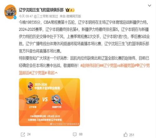 遼寧男籃官方宣布,因肌肉拉傷缺席此前遼籃全部比賽的趙繼偉,目前已經(jīng)確定會在本場比賽中出戰(zhàn)。