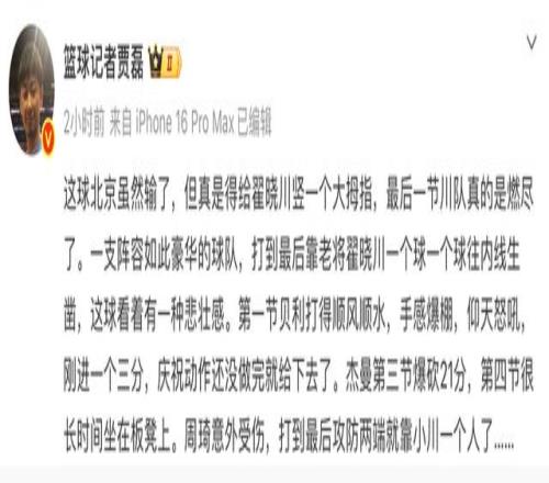 賈磊這段文字既是對老將翟曉川的夸獎,也是對北京教練組使用外援辦法的不滿,此役杰曼砍下29分,第三節(jié)轟下21分,貝利則入賬11分,北京隊內(nèi)只有3人得分上雙,另外一人是翟曉川的15分。