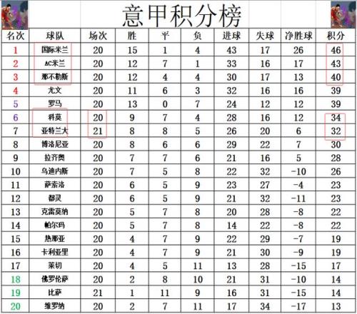 積分榜方面,國(guó)米和AC米蘭本周中補(bǔ)賽都贏了球,國(guó)米還是3分優(yōu)勢(shì)力壓AC米蘭領(lǐng)跑,那不勒斯補(bǔ)賽無力贏球被拉開差距,落后國(guó)米6分,少AC米蘭3分排在第3。亞特蘭大今天要是能贏球奪得4連勝的話,就能追上黑馬科莫,只是他們最后慘遭絕平,3連勝被終止,差科莫2分暫時(shí)還是排在第7。