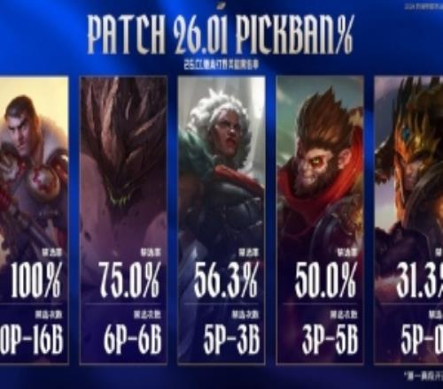 26.01版本第一賽段開賽至今打野英雄禁選率一覽,其中杰斯禁選率達(dá)到100%;