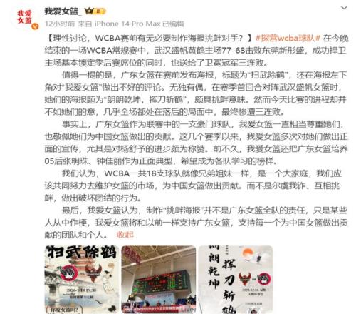 一場普通的WCBA常規(guī)賽卻因為賽前海報遭到了爭議:廣東女籃在與武漢女籃的賽前海報內(nèi)容為“掃武除鶴”,沒想到卻被對方擊敗,遭遇三連敗。賽后,自媒體“我愛女籃”也對廣東女籃的海報內(nèi)容進行了反擊。