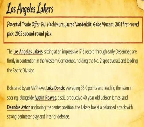 美媒《Fadeaway World》則直接撰文建議,湖人應(yīng)該考慮打包將范德比爾特、八村壘、文森特、2031年的首輪簽以及2032年的次輪簽,以換回這位兩屆全明星前鋒。