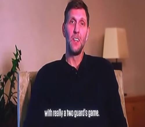 今天他打2號位——賽后德克發(fā)祝賀視頻,第一句話,“他就是個(gè)七尺長人,2號位技藝”——超過了德克。