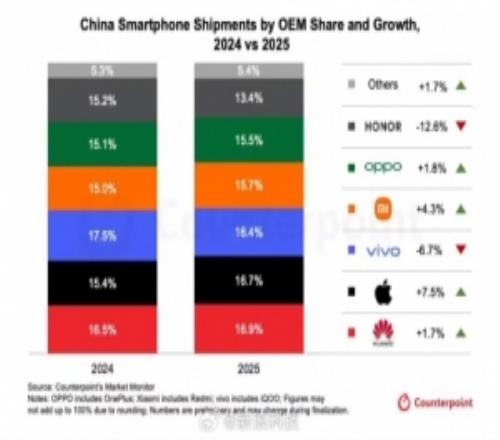 體育資訊1月19日?qǐng)?bào)道宣稱 Counterpoint Research 在今日發(fā)布的新聞稿中表示,中國(guó)智能手機(jī)市場(chǎng) 2025 年第四季度出貨量同比減少 1.6%,而 2025 年全年的出貨則減少了 0.5%。
