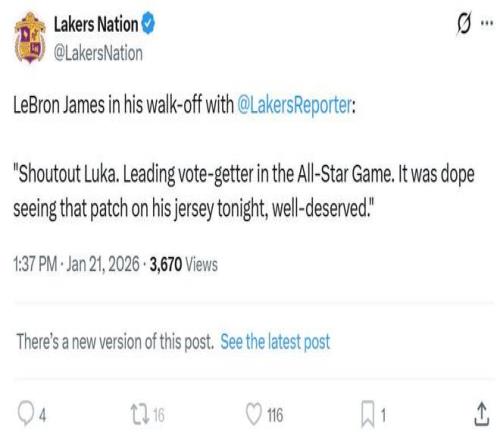 在本場(chǎng)比賽開(kāi)始前,湖人隊(duì)官方宣布東契奇的球衣上將帶有全明星徽章。