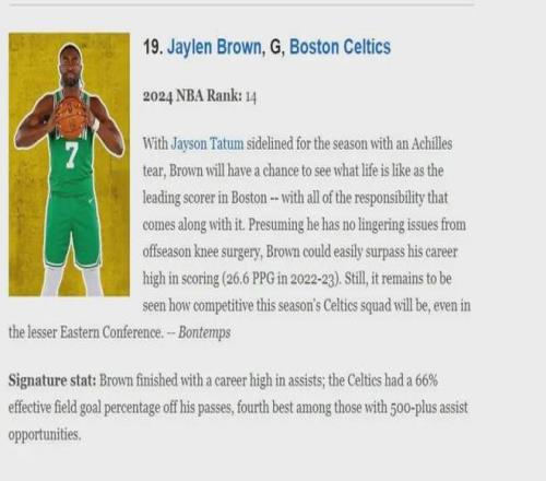杰倫-布朗一直受到一定程度的低估,他在超頂薪續(xù)約時(shí)、獲得總決賽MVP時(shí)都有許多反對質(zhì)疑聲音,而且凱爾特人管理層也確實(shí)曾認(rèn)真考慮過關(guān)于杰倫-布朗的交易方案,在賽季初ESPM評選的2025-26NBA百大球星中,布朗僅位列第19位,網(wǎng)站評語如下:由于塔圖姆跟腱撕裂賽季報(bào)銷,布朗將體驗(yàn)波士頓凱爾特人隊(duì)頭號得分手的生活—以及隨之而來的所有責(zé)任,假設(shè)他沒有受到休賽期膝蓋手術(shù)的后續(xù)影響,那他很有可能超越職業(yè)生涯最高的場均得分(2022-23賽季26.6分),不過即便身處實(shí)力相對較弱的東部聯(lián)盟,以目前凱爾特人隊(duì)的競爭力究竟有何表現(xiàn)仍有待觀察.