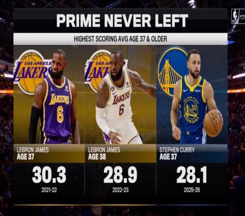 同樣頂尖,37歲詹姆斯場(chǎng)均得分30.3分,高于37歲庫(kù)里本賽季的28.1分 -