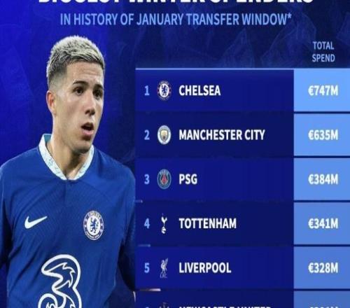 冬窗歷史轉(zhuǎn)會(huì)支出榜:切爾西7.47億歐居首,前十英超占8席 -